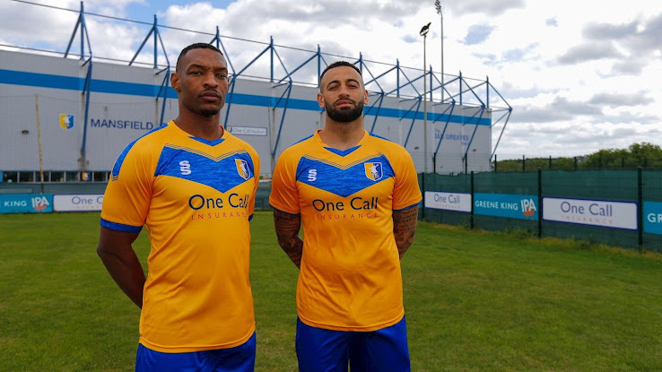 Das neue Mansfield Town Trikot wird von Surridge produziert und durch blaue Hosen und bernsteinfarbene Stutzen ergänzt.