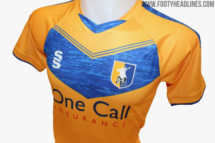 Das neue Trikot verfügt über ein stylisches blaues V, das den traditionellen Bernstein von Mansfield Town überlappt.