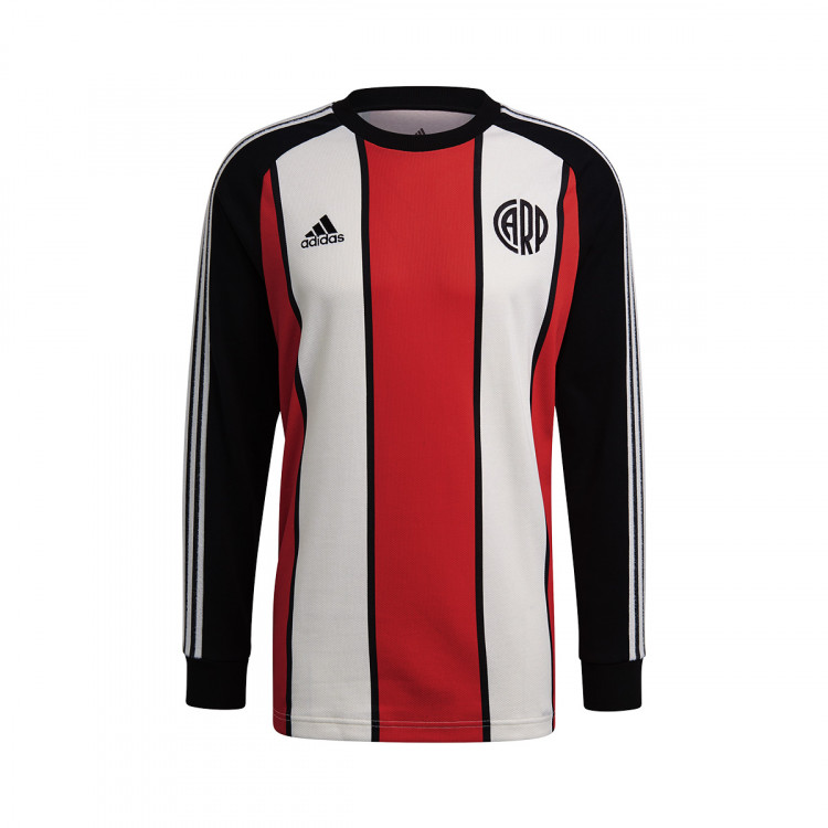 Die Ärmel sind komplett schwarz mit weißen 3-Streifen, während ein einfacher schwarzer Rundhalskragen das Erscheinungsbild abrundet. Ein ehemaliges River Plate Logo befindet sich auf der linken Brustseite.